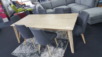 The Wanaka 7 pce dining suite is full of rustic charm and style. Made from a combination of solid and veneer acacia wood with a light brown/gray wash finish. The dining chairs are fully upholstered in dark gray durable fabric and make for a comfortable sitting experience,